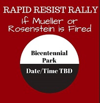 Red square with white words at top Rapid Resist Rally if Mueller or Rosenstein is fired and below a circle with white at top and black letters saying Bicentennial Park and black bottom saying Date/time TBD