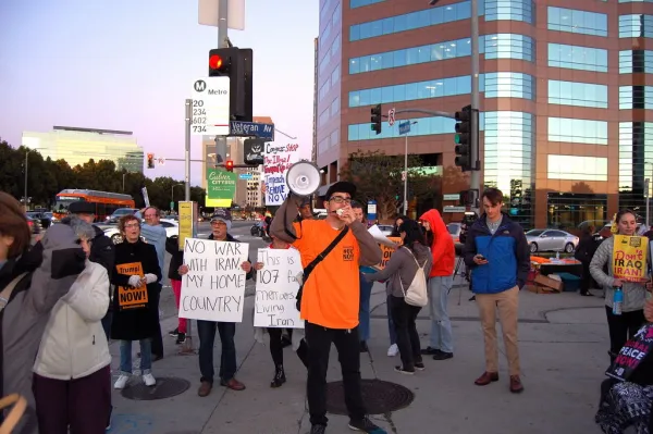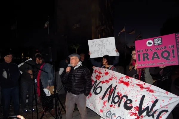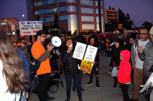 As Emperor Trump cries havoc and lets loose and wags the dogs of war, up to 200 peace protesters held a Jan. 9 antiwar rally outside Los Angeles’ symbol of Washington, the Federal Building located near UCLA in Westwood. The demonstrators ranged from Vietnam era stalwarts to teenagers who have grown up in an America perpetually fighting endless - and unwinnable - wars. They began gathering before the 5:00 p.m. kick off time at the bus stop at the corner of Wilshire Blvd. and Veteran Ave., where info tables were already setup for the Bernie Sanders-for-president campaign and the #OUTNOW! Movement to drive Trump and Pence out of the White House.