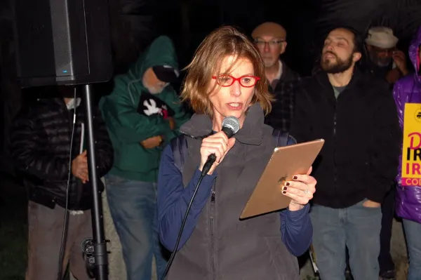 The first speaker identified herself as an Iranian “who just came home three days ago from Iran. I never knew a people who wanted peace more with Americans,” she insisted, contradicting the warlike image U.S. propaganda often projects of Iranians often depicted chanting “Death to America.” The young woman identified herself to me as Darya but understandably did not want her full name used. Another older woman told the crowd: “I’m an Iranian and American and Jewish. Most of all I’m a mother and I don’t want people killed.” Another impromptu speaker said: “I’m a Jewish-American… It’s insanity. Now is the time to stand. War is never the answer!”