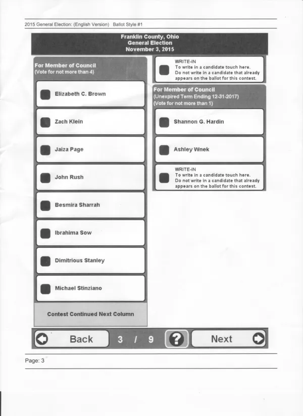Joe Motil, Independent Write-In Candidate for the Unexpired Term Race for Columbus City Council is claiming that the Franklin County Board of Elections has purposely attempted to deceit voters from correctly writing in his name for Columbus City Councils Unexpired Term Race. It is also confusing for Write-In candidate Keith Hatton who is running in the City Council field race. While canvassing for votes at Whetstone Recreation Centers polling place this morning, Mr. Motil said that several people indicated to him that it was confusing as to which button to press in order to write him in. One voter said that they actually wrote him in the wrong race and then corrected it after reviewing their ballot. After receiving a photo from a supporter of how the voting screen was set up it became obvious. Motil states, “As indicated on the front of my campaign literature, I am running for Fairness and Equality. I did not expect to be battling for fairness against the partisan politics of the Franklin County Board of Elections as well.”