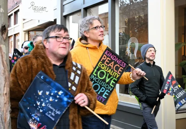 "We need to take this horrible event and turn it around into something that can be really positive for a lot of people," said Kathleen Minor, event organizer. About three dozen community members gathered in the Short North, carrying an array of banners that included the Pride flag, and popular slogans such as “Be The Change.”
