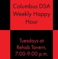 Red and black checkered background and words Columbus DSA Weekly Happy Hour and the details