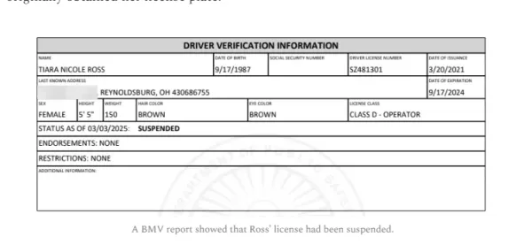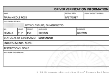 Mr. Byrnes made a records request to the BMV of Ms. Ross’s license which showed that her license had been suspended (see attached). Further evidenced showed that her registration had also expired. The registration sticker on her vehicles license plate while in the parking lot of the Board of Elections was dated September 2024.