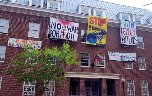 Here’s one possibility, as described by Medea Benjamin, who writes about the struggle for control over the Venezuelan embassy in Washington, D.C., which was evacuated by its diplomats after the U.S. broke diplomatic ties with the Maduro government: “Determined to avoid another war, a group of U.S. peace activists sought and received permission from the legitimate Venezuelan government to form an Embassy Protection Collective. Since April 15, a group has been living in the Embassy, sleeping on couches and floors, while outside supporters have been providing supplies and joining them for meals and educational events.”