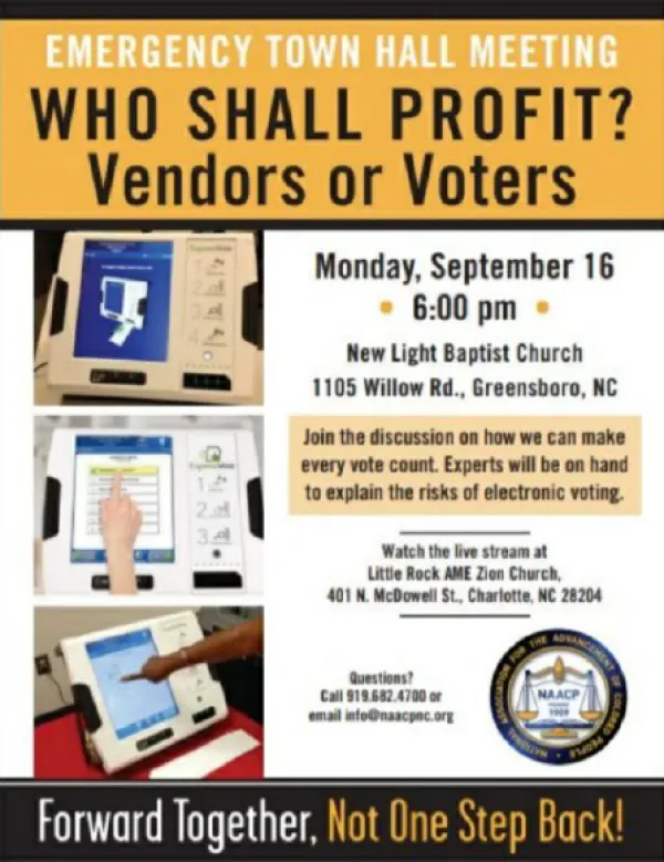 On Monday, September 16, 2019 in Greensboro, North Carolina an Emergency Town Hall meeting was presented by the North Carolina NAACP. An network audience of churches across the state was introduced to a distinguished panel of election integrity advocates and computer security experts who shared their experiences and warned of the risks of electronic voting. The New Light Missionary Baptist Church fascilitated the event that attracted local citizens, officials, advocates, and subject matter experts.