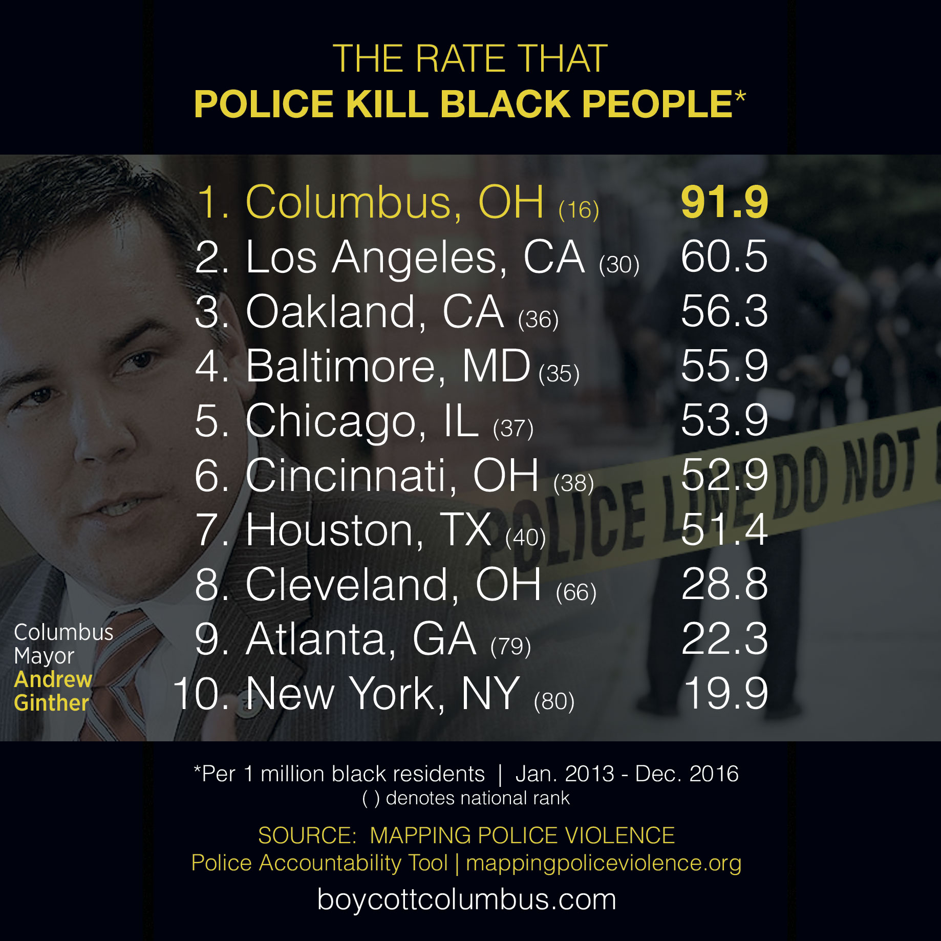 Columbus police have killed almost half as many black people as their Chicago counterparts, even though Chicago has a black population four times that of Columbus.