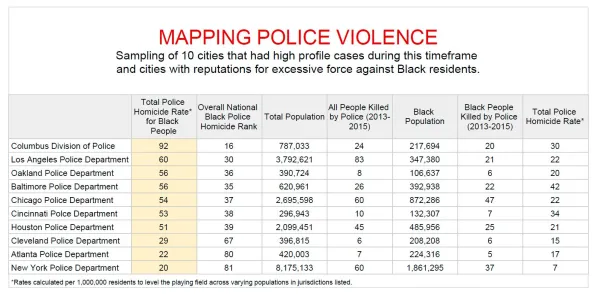 Dispatch Article: “Analyzing the group’s database, however, shows that figure does not come close to representing the organization’s findings for the four-year period. Columbus police killed 20 black people in that stretch, a rate of 23.0 per million black Columbus residents.