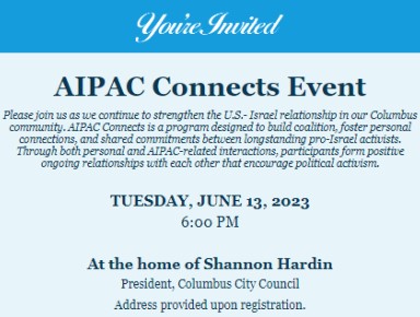 Public records show a particularly close relationship between AIPAC and Council President Hardin, who hosted an official “AIPAC Connects Event” at his home in June 2023 to “strengthen the U.S. - Israel relationship in our Columbus community.” Below is the email invitation to the event. “It’s really a tough power dynamic and hard to combat” said one resident “[AIPAC] money has gone to candidates who will never speak out against these [Israel’s] humanitarian violations.” Hardin, Favor, and Barroso de Padilla have not responded to requests for comment.