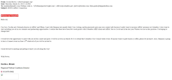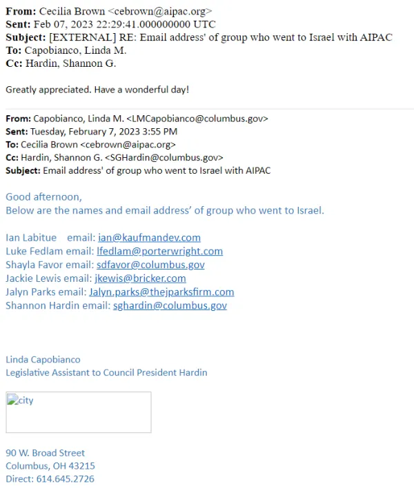 Few residents know about these AIEF sponsored trips. The City’s records reveal that Councilmember Lourdes Barroso de Padilla, Council President Shannon Hardin, and Councilmember Shayla Favor attended AIEF funded trips to Israel prior to October 7, 2023. Despite requesting records involving AIEF for all City Council members, we only received detailed documentation of Councilmember Barroso de Padilla’s trip. However, other records refer to Council President Shannon Hardin and Councilmember Shayla Favor as “Columbus AIEF alum” and they attended get-togethers with AIPAC Regional Political Coalition Director, Cecelia Brown. Additional emails between Brown and Hardin’s Legislative Assistant, Linda Capobianco, indicated that Hardin and Favor attended trips to Israel although the details of the trip remain unknown. In a February 7, 2023 email, Capobianco identified Hardin, Favor, and four other influential figures in Columbus law and finance as the “group who went to Israel.”